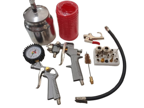 + Free Shipping• Kit consists of a Mini blow gun; 4 meter recoil air hose with couplings; suction powered paint spray gun; tyre inflator; 6 masks; cleaning brush; 2 inflating needles; 2 nozzles and 10 assorted couplers